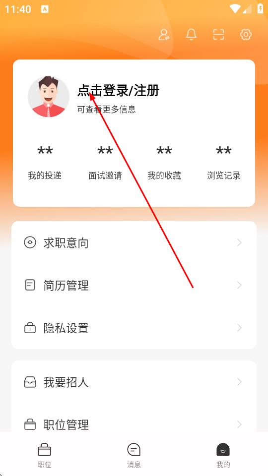 2、在我的頁面,點擊點擊登錄/注冊區(qū)域。