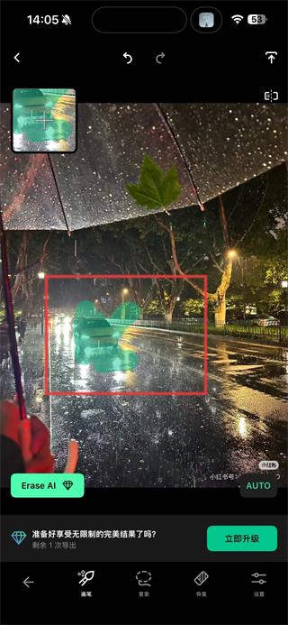3、在物體去除界面,用綠色標(biāo)記工具涂抹需要去除的物體區(qū)域,然后點(diǎn)擊Erase AI按鈕,應(yīng)用AI技術(shù)自動(dòng)去除標(biāo)記的物體。