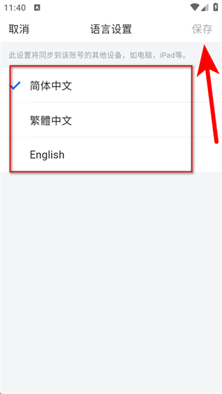 4、在語言設(shè)置頁面,選擇需要的語言,點擊保存完成語言設(shè)置。