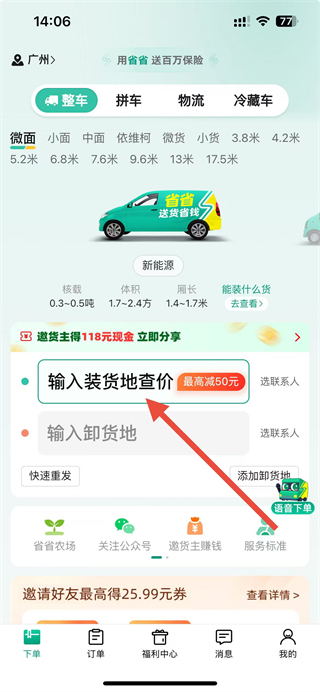 1、在省省回頭車下單頁面,點擊裝貨地址,選擇裝貨的地址。