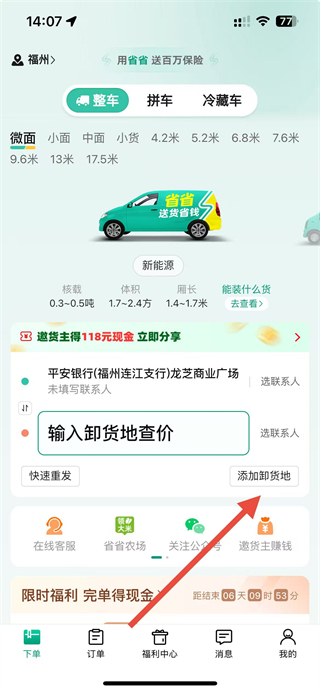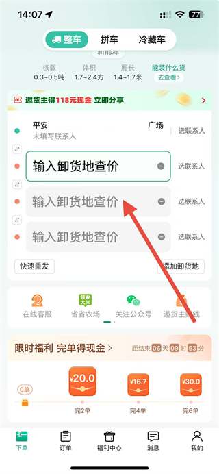 2、確定裝貨地址后,接著點擊添加卸貨地選項,可添加多個途經(jīng)點的卸貨地。