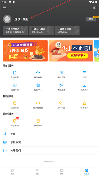 1、打開PP視頻App,點(diǎn)擊底部導(dǎo)航欄最右側(cè)的未登錄的選項(xiàng),進(jìn)入個(gè)人中心頁(yè)面。