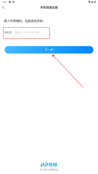 3、輸入要注冊(cè)的手機(jī)號(hào),再點(diǎn)擊下一步的按鈕。