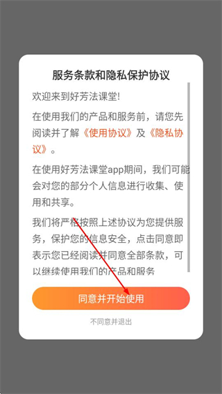 1、打開好芳法課堂APP,在彈出的服務(wù)條款和隱私保護(hù)協(xié)議界面,點(diǎn)擊同意并開始使用。