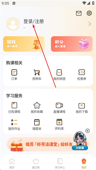 3、在我的頁面中,點(diǎn)擊登錄/注冊(cè)選項(xiàng)。