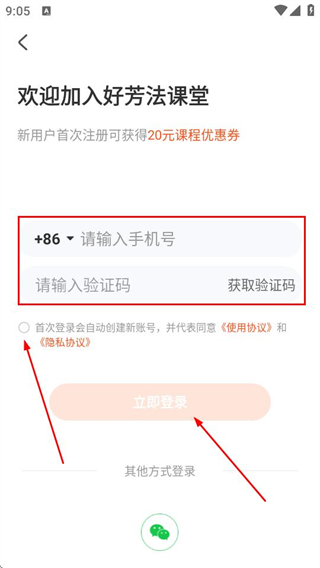 4、輸入手機(jī)號(hào)碼,填入驗(yàn)證碼填,勾選同意相關(guān)協(xié)議后,點(diǎn)擊立即登錄即可。