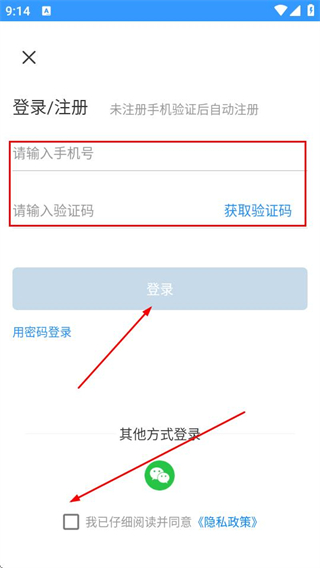4、輸入手機(jī)號(hào)碼,獲取驗(yàn)證碼,勾選隱私政策,點(diǎn)擊登錄按鈕。
