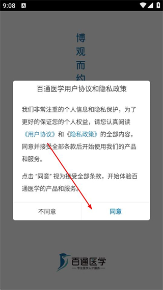 1、打開(kāi)百通醫(yī)學(xué)APP,在彈出的百通醫(yī)學(xué)用戶(hù)協(xié)議和隱私政策界面,點(diǎn)擊同意。