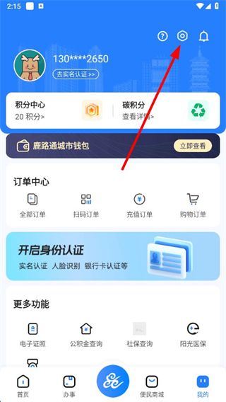 1、打開(kāi)鹿路通APP,在我的頁(yè)面點(diǎn)擊右上角設(shè)置圖標(biāo)。
