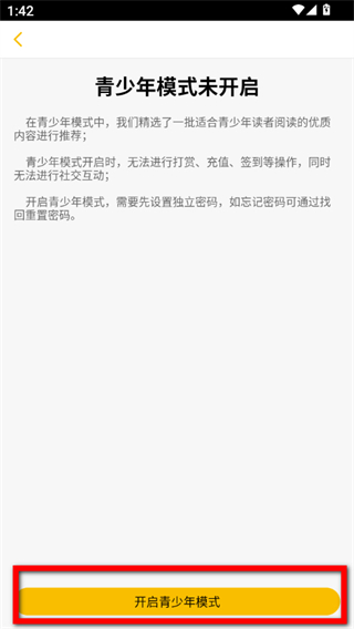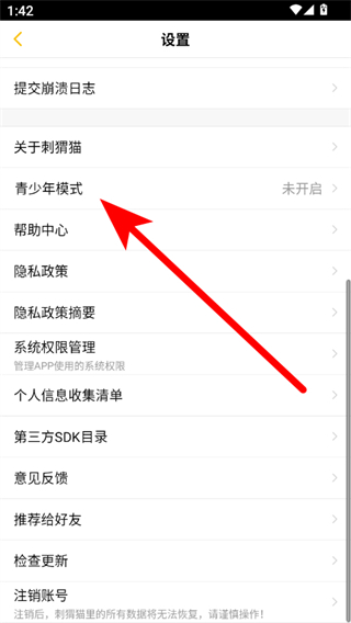 3、在設(shè)置頁面,點(diǎn)擊青少年模式選項(xiàng),進(jìn)入青少年模式說明頁面。
