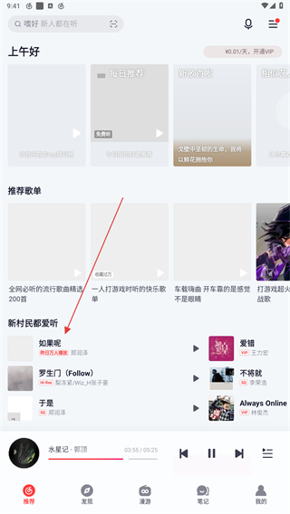 1、啟動(dòng)網(wǎng)易云音樂,進(jìn)入首頁點(diǎn)擊要播放的歌曲。