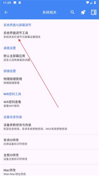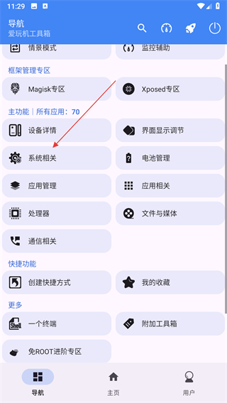 1、打開(kāi)愛(ài)玩機(jī)工具箱APP,在導(dǎo)航頁(yè)面點(diǎn)擊系統(tǒng)相關(guān)選項(xiàng)。