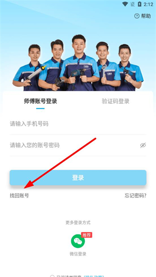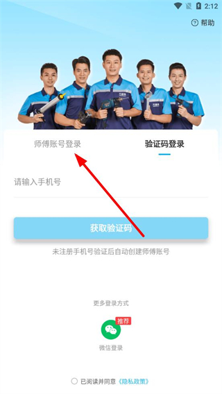 1、打開萬師傅A(chǔ)PP,在登錄頁面點(diǎn)擊師傅賬號登錄選項(xiàng)。