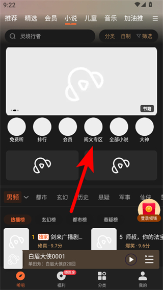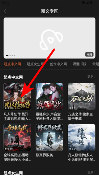 2、在小說頁面,點(diǎn)擊閱文專區(qū)選項(xiàng),進(jìn)入對(duì)應(yīng)專區(qū)頁面。
