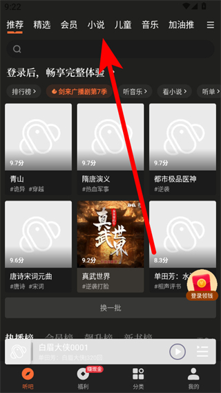 1、在懶人聽書首頁,點(diǎn)擊上方小說選項(xiàng),進(jìn)入小說頁面。