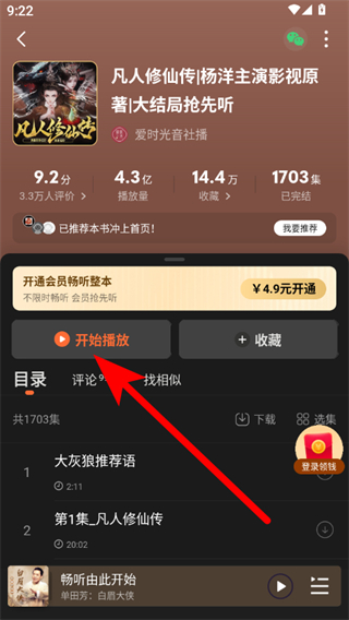 4、在小說詳情頁面,點(diǎn)擊開始播放按鈕,即可開始聽小說。