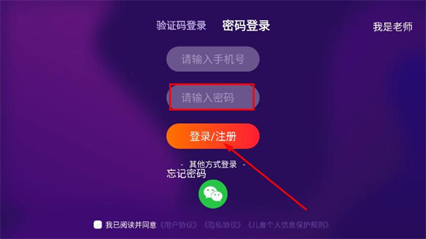 3、填寫密碼,點(diǎn)擊登錄/注冊,即可完成登錄。
