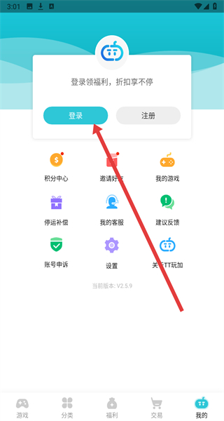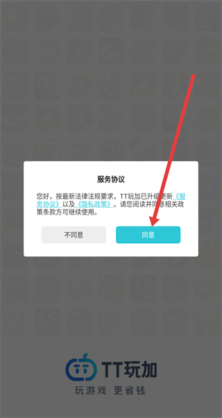 1、點(diǎn)擊“服務(wù)協(xié)議”彈窗的“同意”,進(jìn)入TT玩加APP主界面。