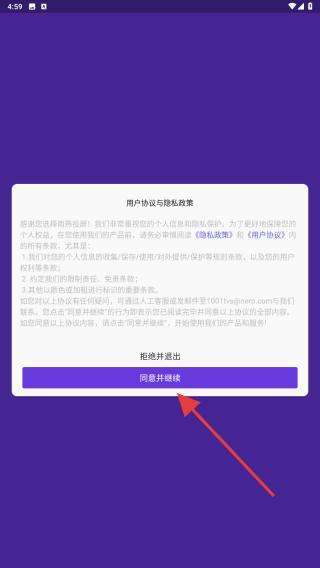 1、打開雨燕投屏APP,進(jìn)入時(shí)會(huì)彈出用戶協(xié)議與隱私政策,點(diǎn)擊同意并繼續(xù)即可。