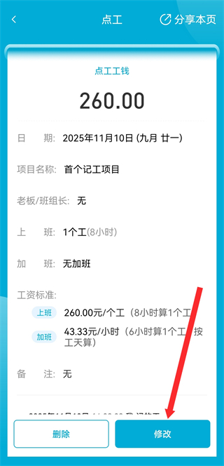 4、若需修改,點(diǎn)擊記工記錄,選擇修改即可調(diào)整記工信息。