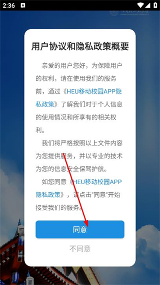 1、打開移動(dòng)校園app,在彈出的窗口中點(diǎn)擊同意按鈕。