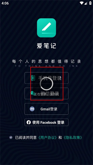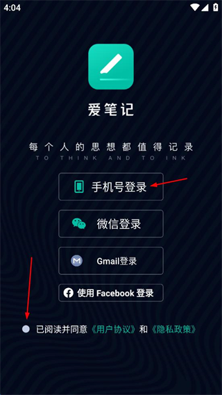 1、打開愛筆記軟件,勾選已閱讀并同意用戶協(xié)議和隱私政策,點擊手機號登錄。
