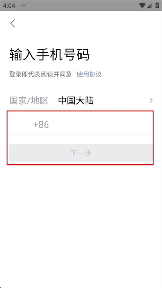 2、進(jìn)入輸入手機號碼界面,在+86后輸入手機號碼,點擊下一步。