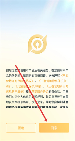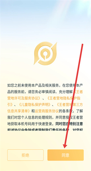 1、點(diǎn)擊協(xié)議彈窗的“同意”,接受王者營地服務(wù)協(xié)議與隱私政策,進(jìn)入手機(jī)號登錄界面。