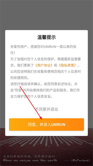1、打開unirun APP,在溫馨提示頁面點擊同意,并進(jìn)入UNIRUN。