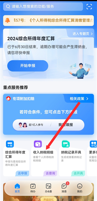 1、打開個人所得稅APP,在首頁點擊收入納稅明細。