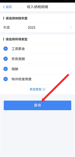 2、進入收入納稅明細頁面后,選擇納稅年度,勾選所得類型點擊查詢。