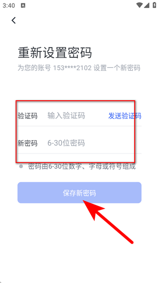 4、在重新設(shè)置密碼頁面輸入驗證碼和新密碼,點擊保存新密碼,即可完成稿定設(shè)計APP密碼的修改。