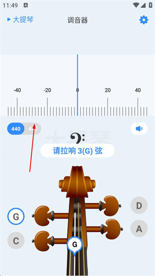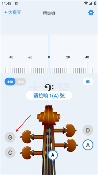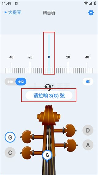 3、接著拉響3(G)弦,調(diào)整音高,可切換440或442的音準(zhǔn)標(biāo)準(zhǔn)。