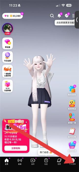 1、打開(kāi)崽崽Zepeto,點(diǎn)擊主界面右側(cè)的角色裝扮圖標(biāo),進(jìn)入角色裝扮頁(yè)面。