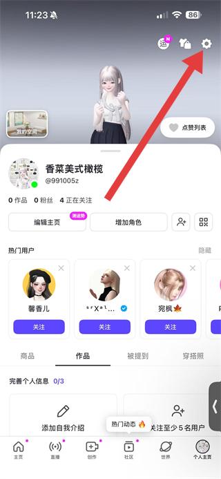 1、打開(kāi)崽崽ZEPETO APP,點(diǎn)擊右下角個(gè)人主頁(yè),進(jìn)入個(gè)人頁(yè)面后點(diǎn)擊右上角設(shè)置圖標(biāo)。