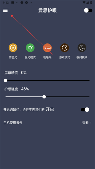 1、打開愛思護眼應(yīng)用,點擊界面左上角三條橫線樣式的菜單圖標,進入設(shè)置頁面。