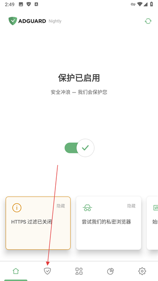 1、打開AdGuard應(yīng)用,點(diǎn)擊防護(hù)圖標(biāo)。