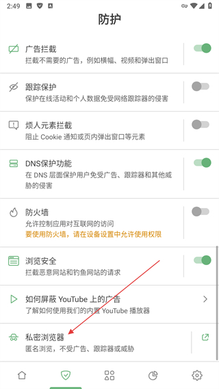 2、在防護(hù)頁面,點(diǎn)擊私密瀏覽器選項(xiàng)。