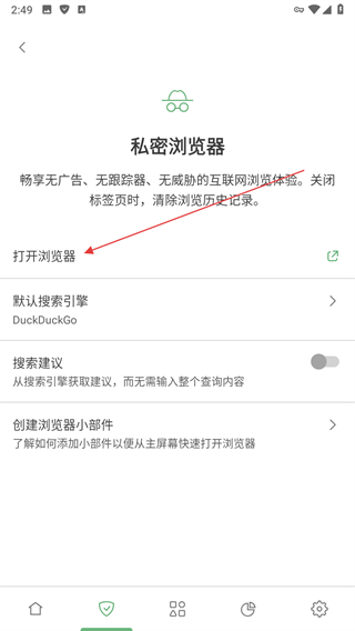3、在私密瀏覽器頁面,點(diǎn)擊打開瀏覽器選項(xiàng)。