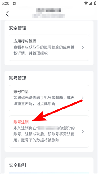 4、在安全管理的頁面,點擊賬號注銷,按提示完成賬號注銷操作。