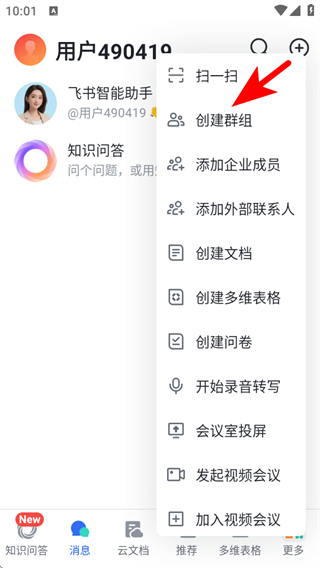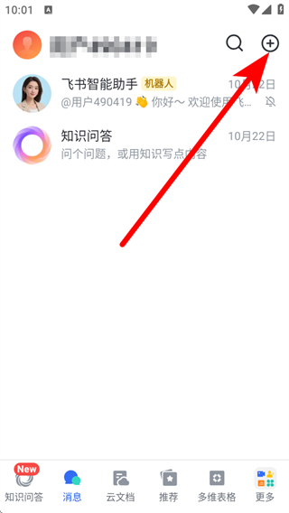 1、打開飛書APP,點擊界面右上角的+按鈕,展開功能的菜單。