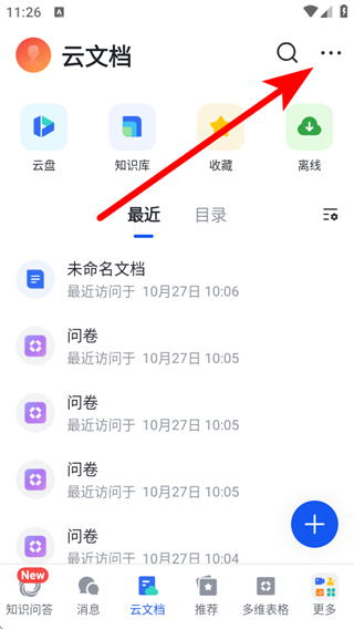 2、在云文檔頁面,點擊右上角的…更多,彈出更多選項列表。