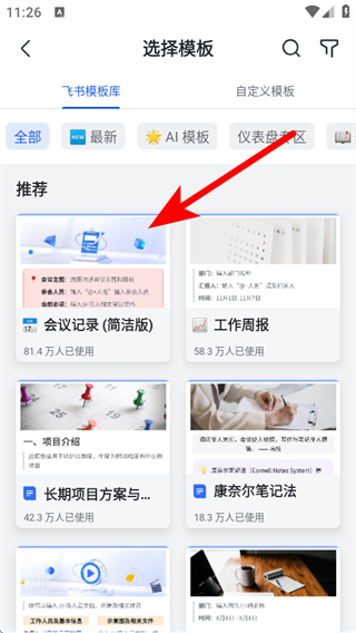 4、在模板庫中,選擇需要的模板,即可使用該模板進行文檔創(chuàng)作。