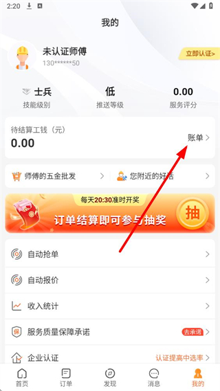 1、在工奇兵我的頁(yè)面,點(diǎn)擊賬單選項(xiàng),進(jìn)入賬單頁(yè)面。