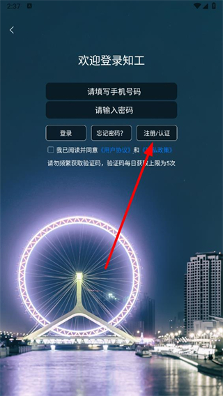 1、打開知工APP,出現(xiàn)服務協(xié)議和隱私政策彈窗,仔細閱讀內容后,點擊同意按鈕。
