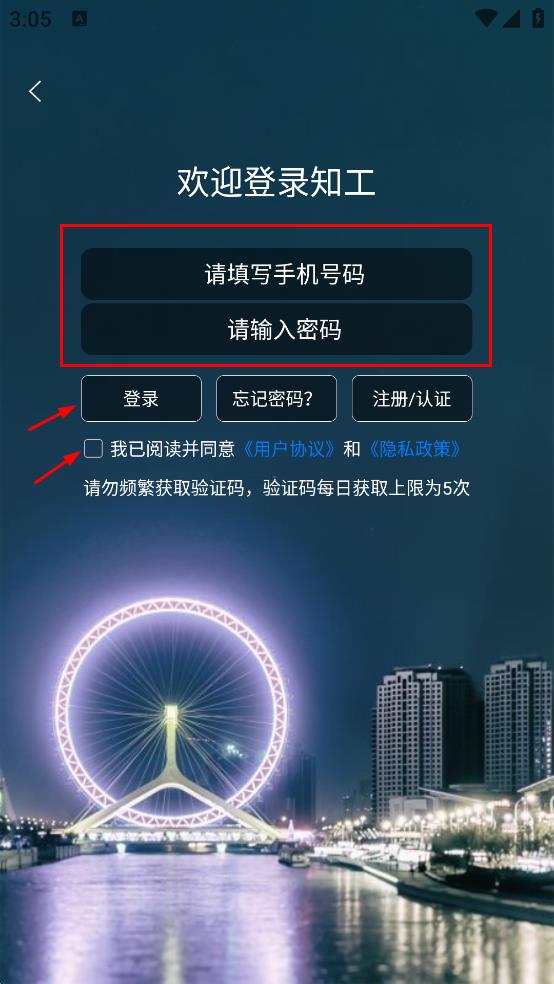 4、在登錄界面,輸入手機(jī)號(hào)碼和密碼,勾選我已閱讀并同意用戶協(xié)議和隱私政策,點(diǎn)擊登錄按鈕。
