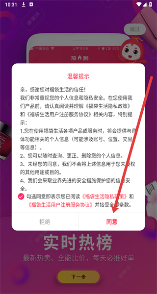 1、點擊“溫馨提示”彈窗的“同意”,進入福袋生活APP主界面。
