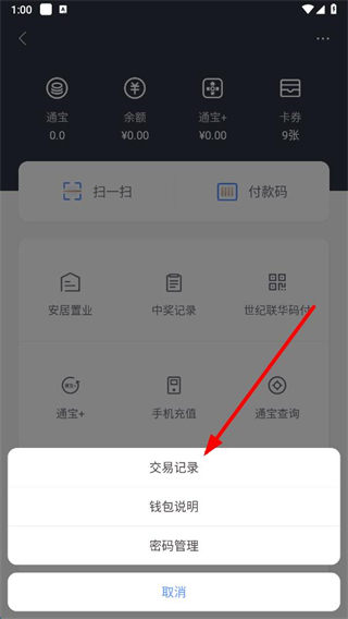 4、在彈出的選項中,點擊交易記錄選項即可查詢交易記錄。