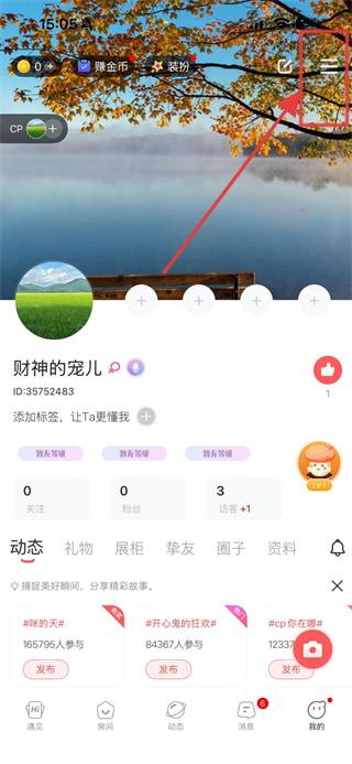 1、打開語玩APP,點擊右上角三條橫線圖標(biāo),彈出功能菜單。