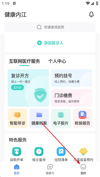 1、打開健康內(nèi)江APP,點(diǎn)擊底部我的,進(jìn)入個人頁面。